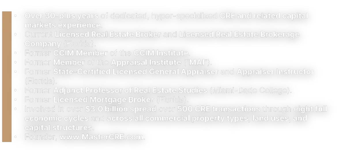 Gregory J. Laskody - a former MAI-designated and State-Certified General Appraiser and General Appraiser Instructor, a former Certified Commercial Investment Member (“CCIM”) of the CCIM Institute, and former adjunct professor of real estate valuation and finance - has been involved in over $3.0 billion in career CRE volume spread over 500 transactions and through eight full economic cycles and across all commercial property types, land uses, and capital structures over more than 30 years.